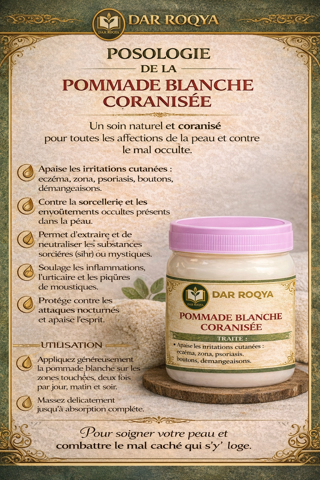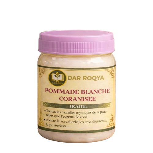 La Pommade Blanche au Karité Coranisée Dar Roqya est un soin naturel à base de beurre de karité, préparé selon la tradition de la roqya. Elle est conçue pour apaiser les affections cutanées tout en accompagnant les pratiques spirituelles de protection.